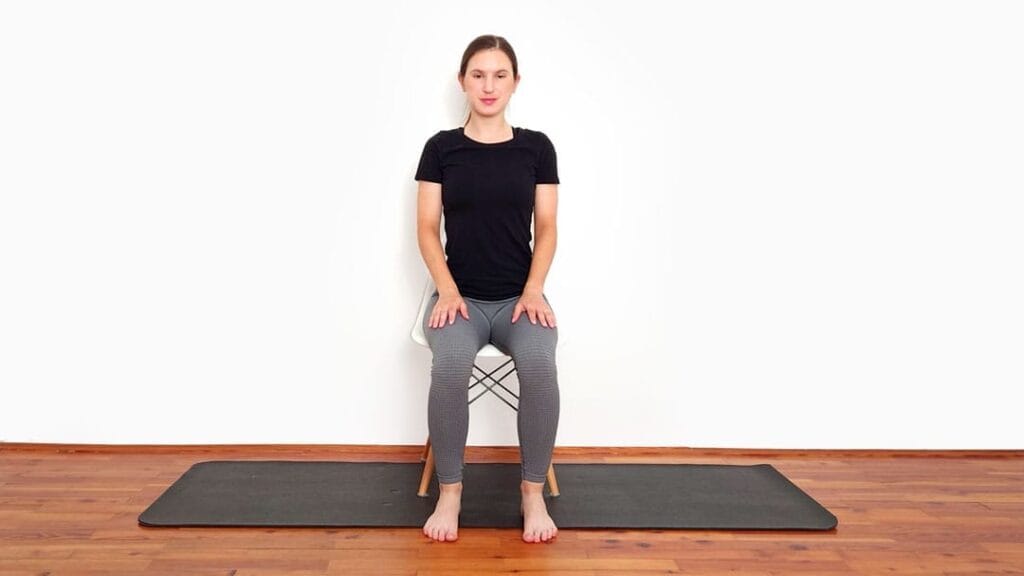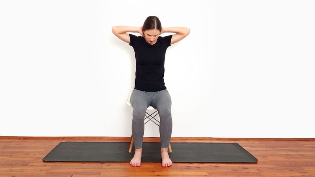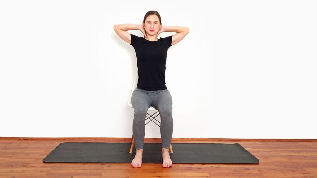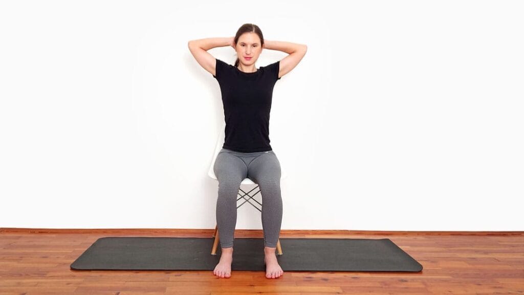 Diese Dehnung löst Spannungen im oberen Rücken, verbessert die Haltung und fördert die Beweglichkeit der Schultern. Einfach im Sitzen durchführbar.